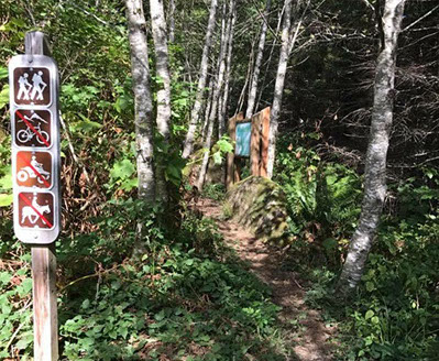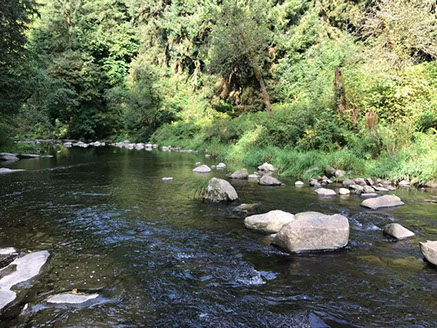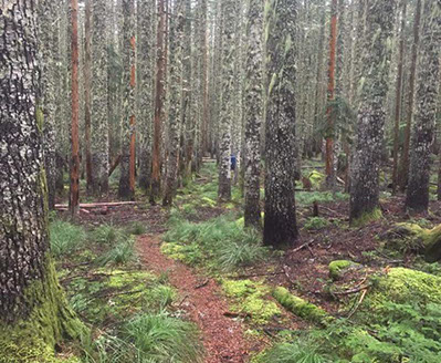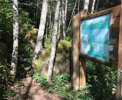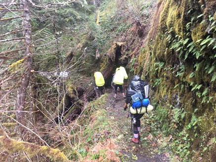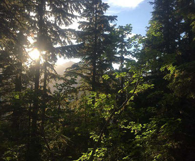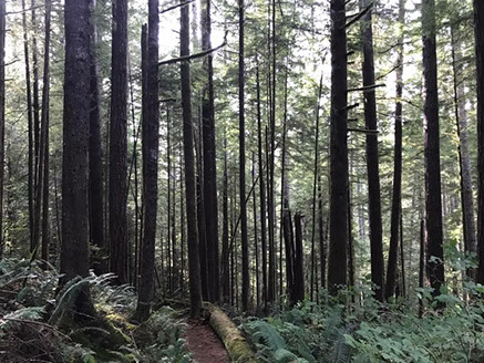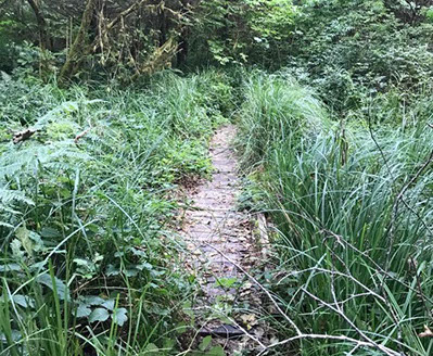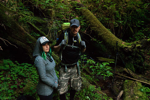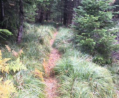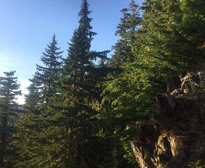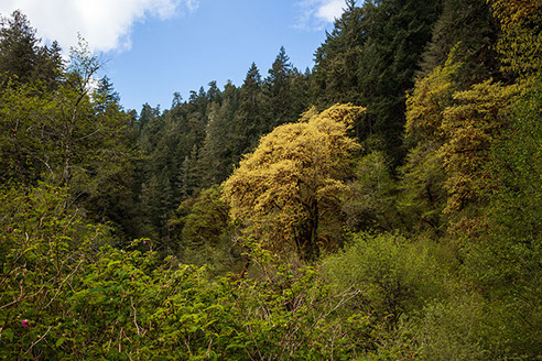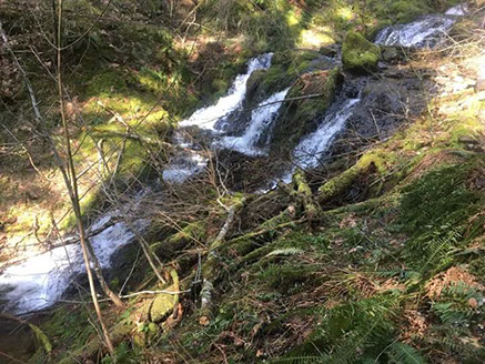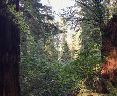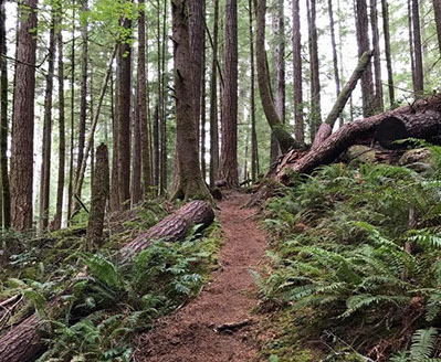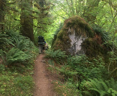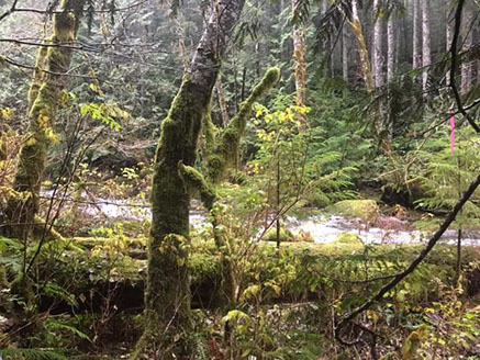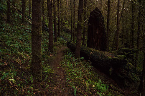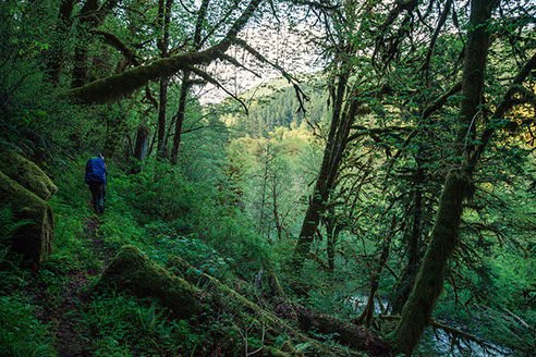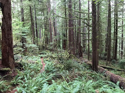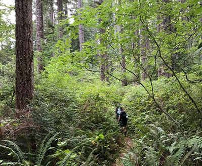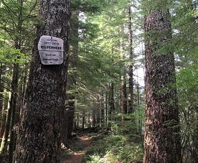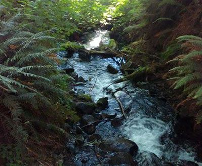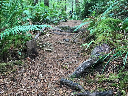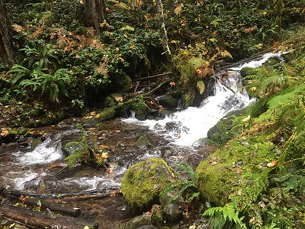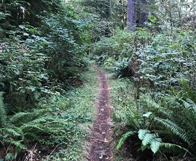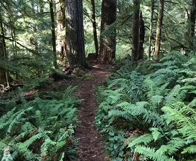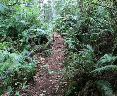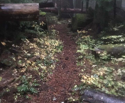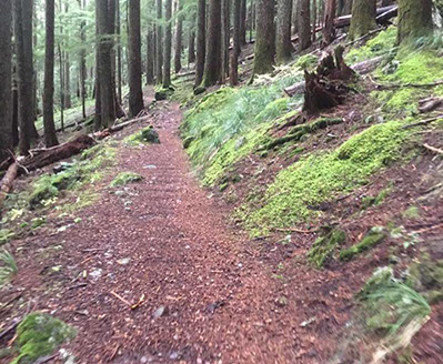 This great trail descends to five or six beautiful dispersed campsites. The down hill is constant on the way in and the way out is a pretty good push. A short trip to the creek, this route is good for beginners. The woods here are plush with sword ferns and old growth cedars. Go to the creek to see lots of crayfish (crawdads) showing off their orange-red shells in the water carved bedrock. The wilderness has a coastal climate that makes it wet and green most of the year. The moss is a favorite feature for hikers and the wildlife is abundant.